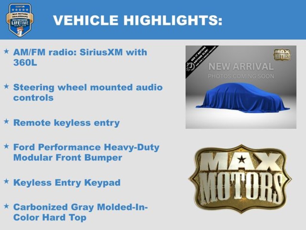 AM/FM radio: SiriusXM with 360L, Carbonized Gray Molded-In-Color Hard Top, Compass, Ford Performance Heavy-Duty Modular Front Bumper, Front & Rear Floor Liners, Front Bucket Seats, Front Row Top Panels Storage Bag, Heated door mirrors, Illuminated entry, Keyless Entry Keypad, Outside temperature display, Power door mirrors, Rear-Window Defroster & Washer, Remote keyless entry, Steering wheel mounted audio controls, Wheels: 17" Black High Gloss-Painted Aluminum.