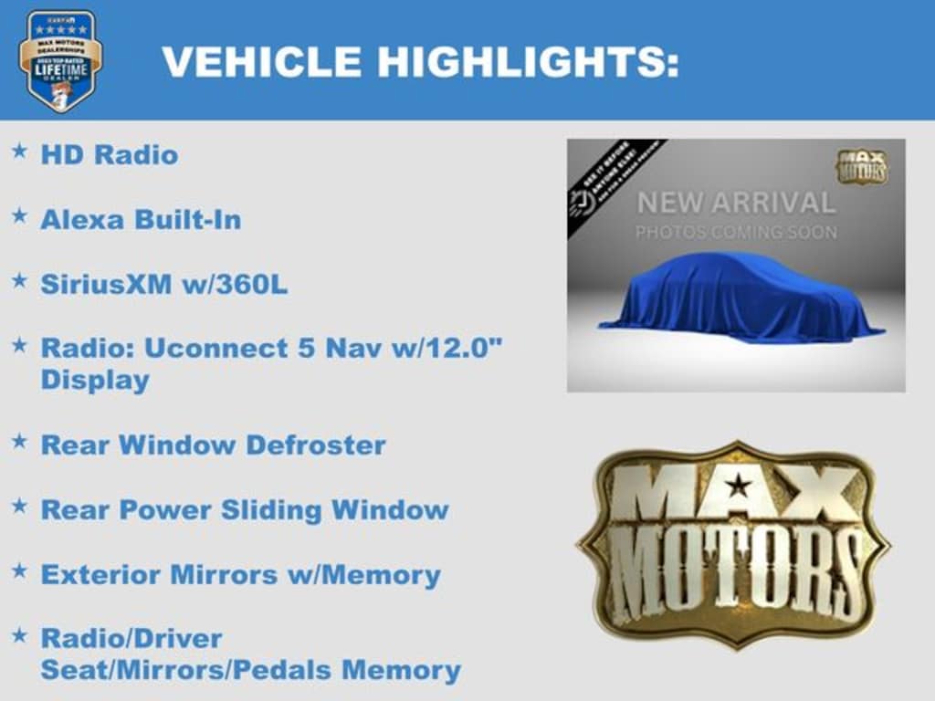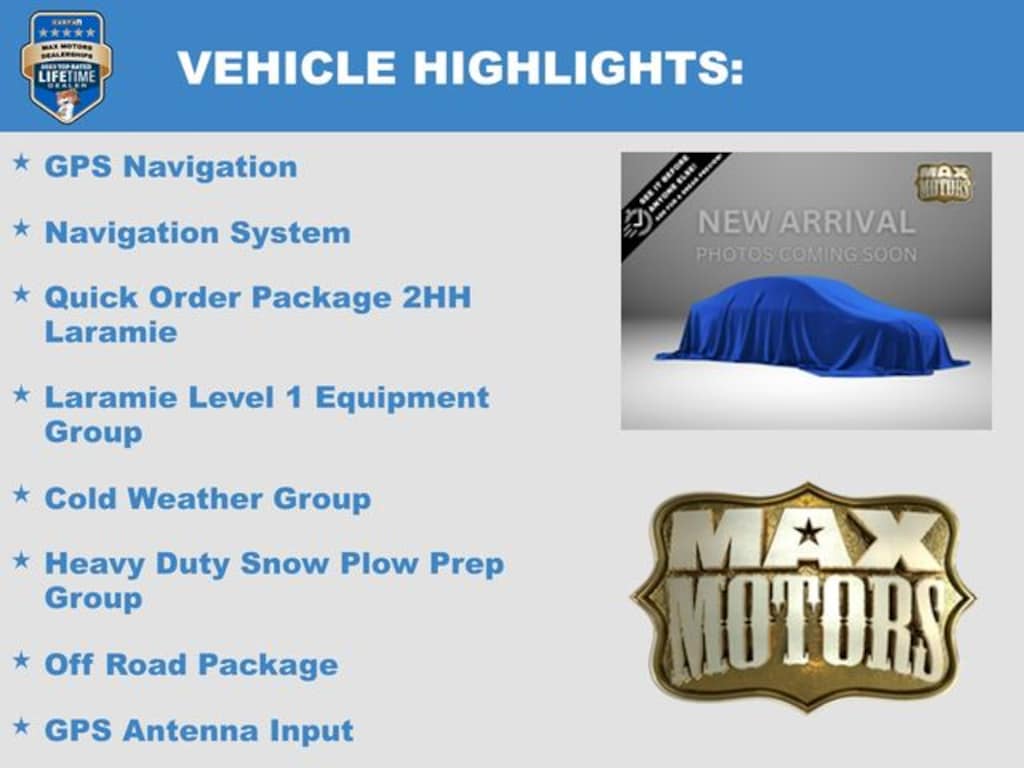 12" Touchscreen Display, 220 Amp Alternator, 2nd Row In Floor Storage Bins, 4G LTE Wi-Fi Hot Spot, Alexa Built-In, Apple CarPlay, Auto Adjust In Reverse Exterior Mirrors, Auto Dim Exterior Mirror, Auto High Beam Headlamp Control, Auto Power-Folding Mirrors, Auto-Dimming Exterior Passenger Mirror, Blind Spot & Cross Path Detection, Chrome Exterior Mirrors, Cold Weather Group, Connected Travel & Traffic Services, Connectivity - US/Canada, Disassociated Touchscreen Display, Engine Block Heater, Exterior Mirrors Courtesy Lamps, Exterior Mirrors w/Heating Element, Exterior Mirrors w/Memory, Exterior Mirrors w/Supplemental Signals, Foam Bottle Insert (Door Trim Panel), For Details, Visit DriveUconnect.com, For More Info, Call 800-643-2112, Forward & Reverse Utility Lights, Front LED Fog Lamps, Front Performance Tuned Shock Absorbers, Global Telematics Box Module (TBM), Google Android Auto, GPS Antenna Input, GPS Navigation, HD Radio, Heavy Duty Snow Plow Prep Group, Hill Descent Control, Integrated Voice Command w/Bluetooth, Laramie Level 1 Equipment Group, LED Reflector Headlamps, Mirror Running Lights, MOPAR Winter Front Grille Cover, Navigation System, Off Road Package, Off-Road Information Pages, ParkSense Front/Rear Park Assist System, Power Adjust Mirrors, Power Adjustable Convex Aux Mirrors, Power Adjustable Pedals w/Memory, Power Heated Fold Telescopic Mirrors w/Memory, Power Telescoping Mirrors, Quick Order Package 2HH Laramie, Radio: Uconnect 5 Nav w/12.0" Display, Radio/Driver Seat/Mirrors/Pedals Memory, Rain Sensitive Windshield Wipers, Rear Performance Tuned Shock Absorbers, Rear Power Sliding Window, Rear Window Defroster, Remote Tailgate Release, Selectable Tire Fill Alert, SiriusXM Radio Service, SiriusXM w/360L, Tow Hooks, Trailer Tow Pages.